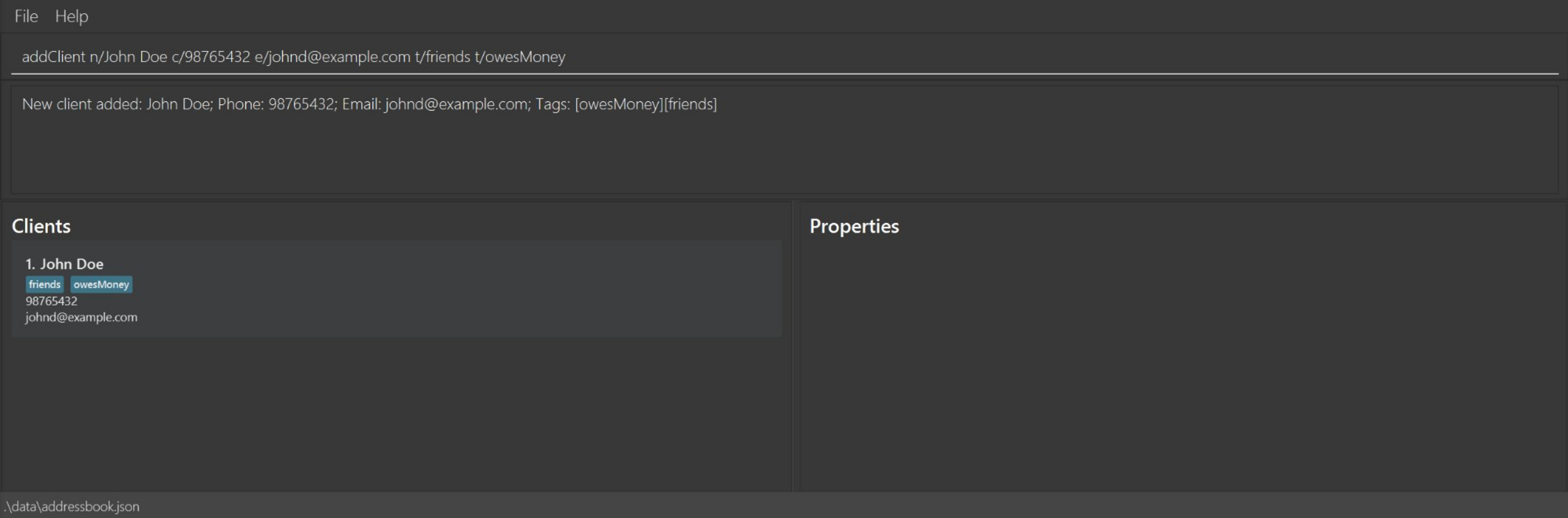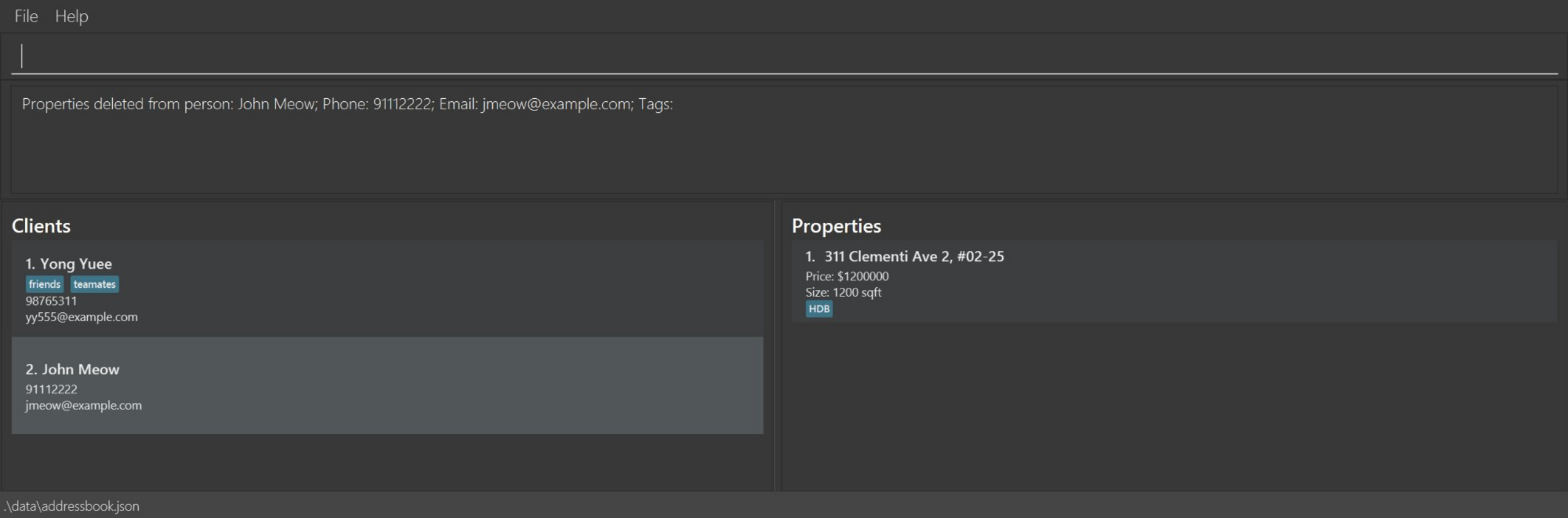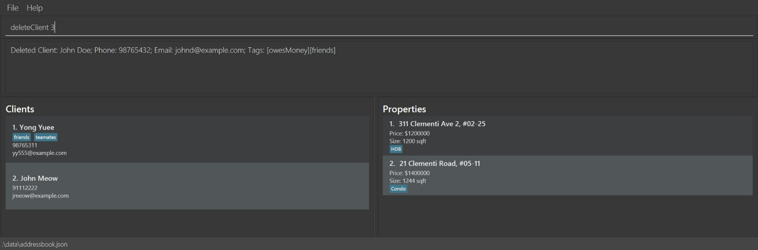 addClient n/John Doe c/98765432 e/johnd@example.comaddClient n/Betsy Crowe t/friend e/betsycrowe@example.com c/1234567 t/criminaladdProperty