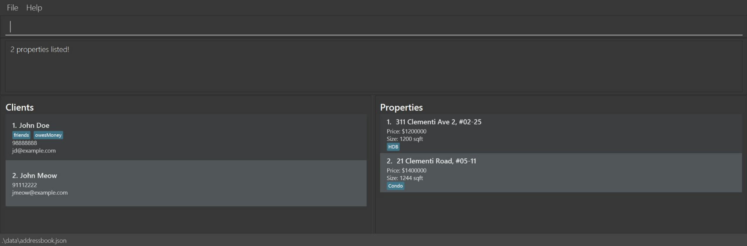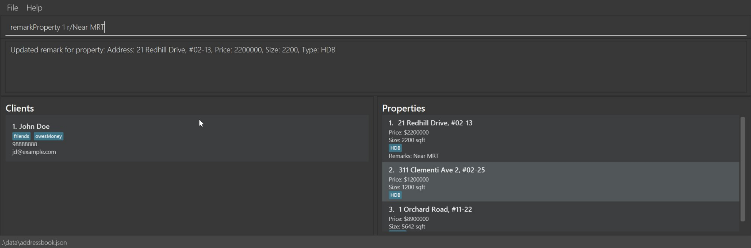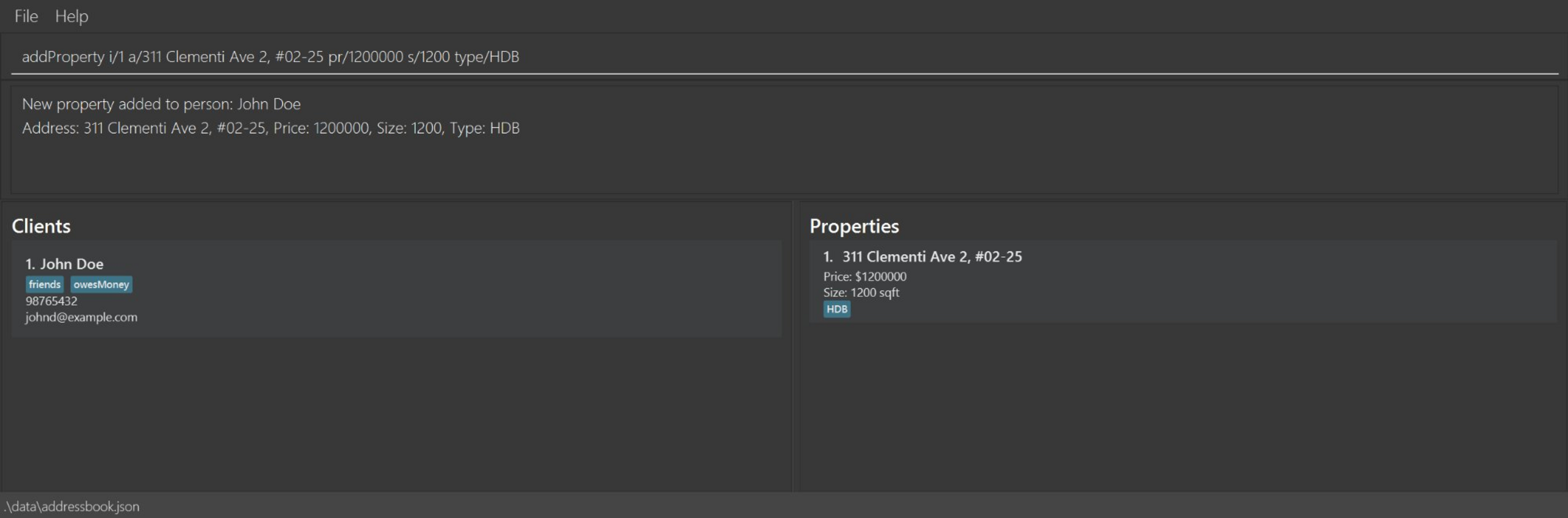addProperty i/1 a/311 Clementi Ave 2, #02-25 pr/1200000 s/1200 type/HDBaddProperty i/2 a/10 Orchard Road pr/2500000 s/1800listShows a list of all clients and their properties in the address book.