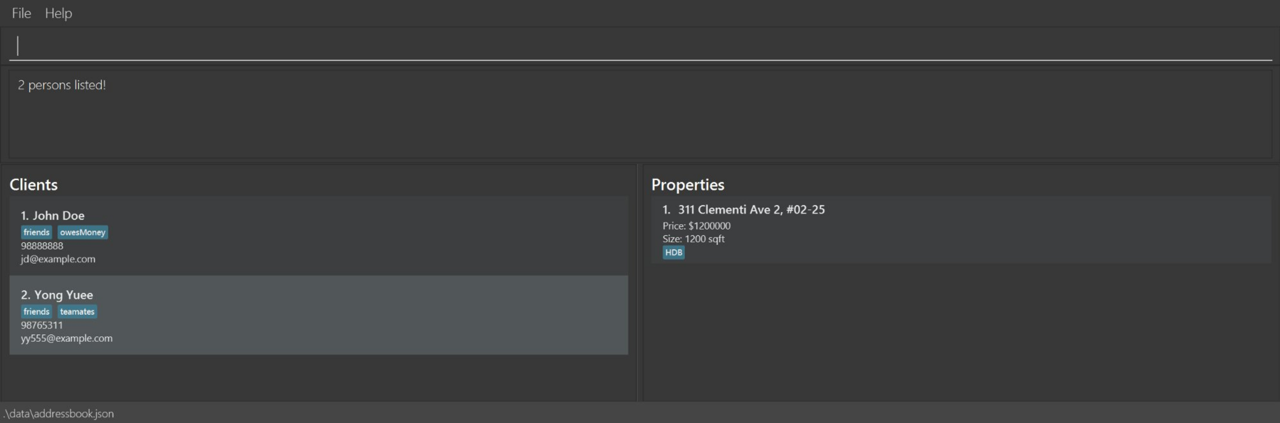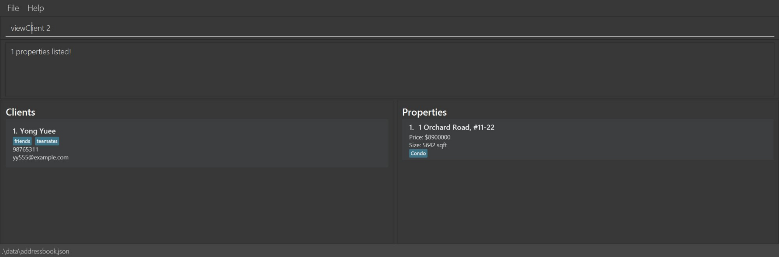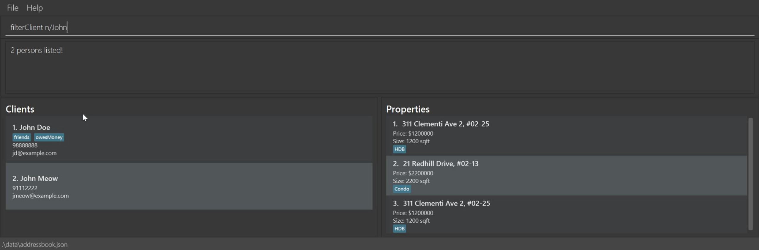 addProperty i/1 a/311 Clementi Ave 2, #02-25 pr/1200000 s/1200 type/HDBaddProperty i/2 a/10 Orchard Road pr/2500000 s/1800listShows a list of all clients and their properties in the address book.