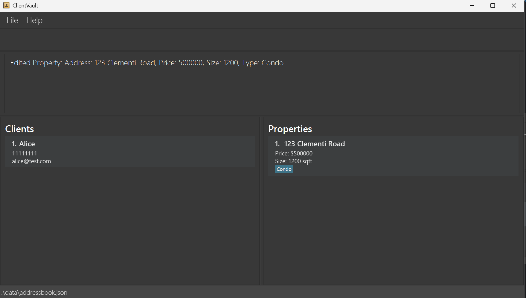 ClientVault data are saved automatically as a JSON file [JAR file location]/data/addressbook.json. Advanced users are welcome to update data directly by editing that data file.